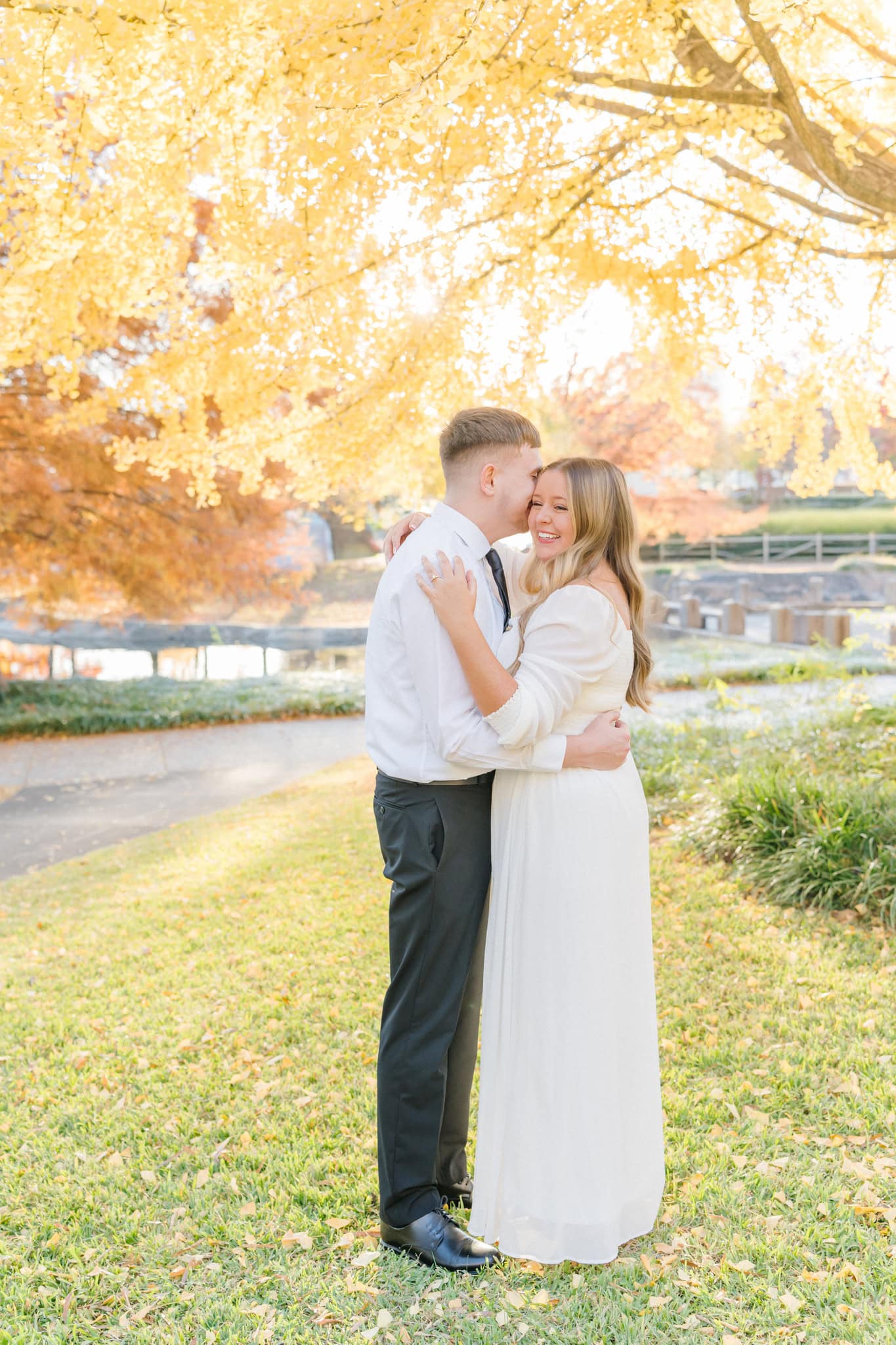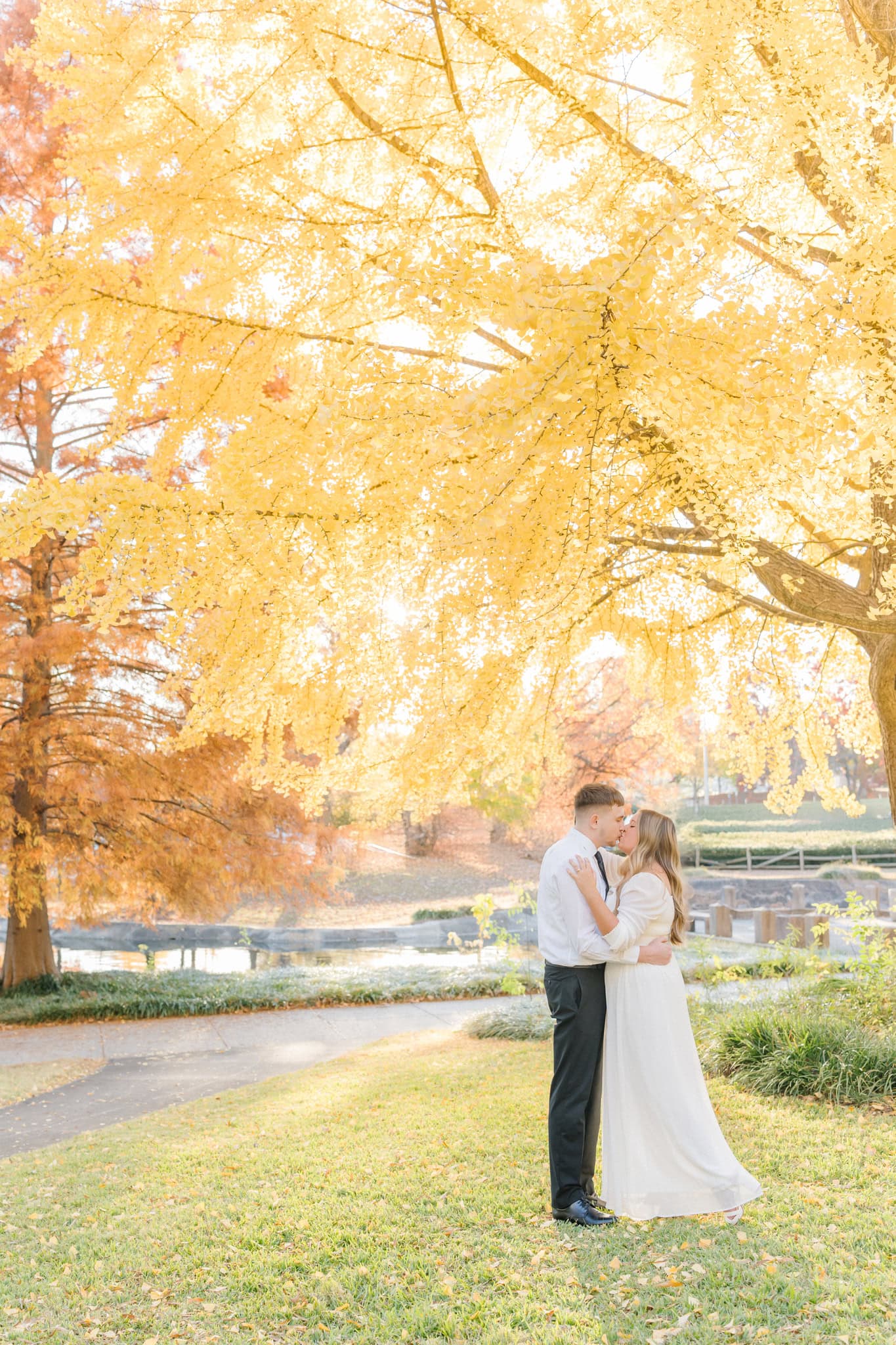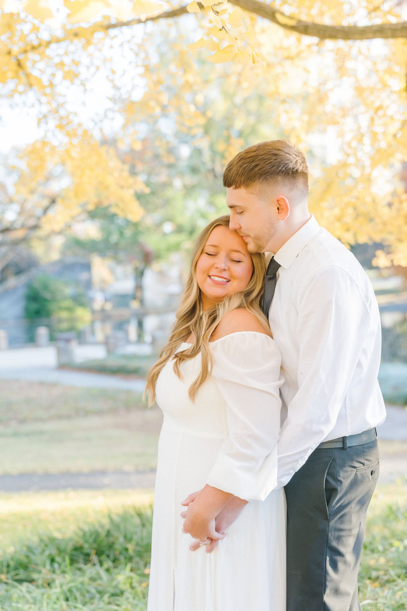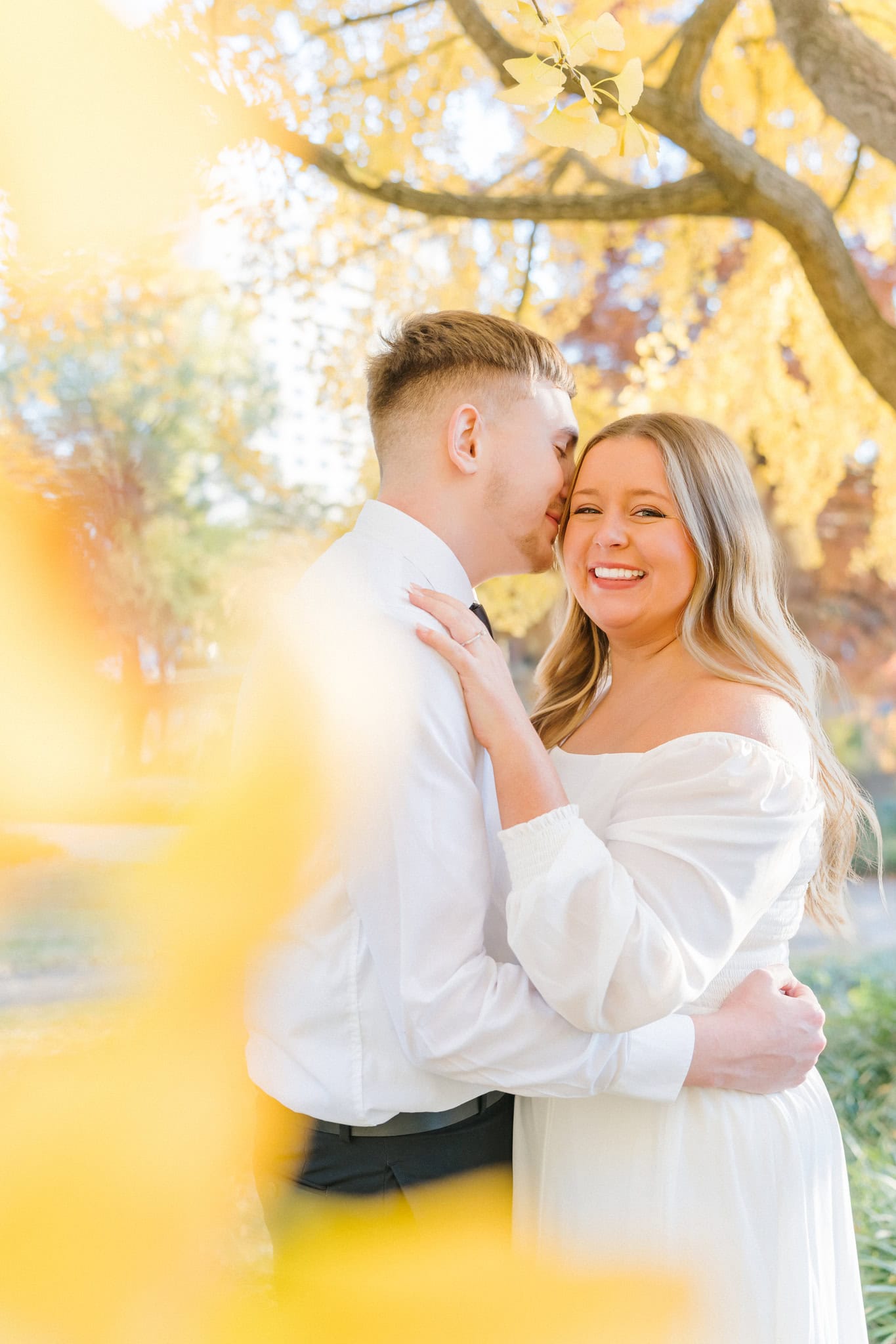 The leaves were just starting to carpet the ground in rich oranges and golds, and it made every shot glow. One of my favorites moments was in front of my favorite tree (the ginkgo tree), wrapped in each other’s arms, with that late-fall sunshine filtering through the trees behind them. It didn’t feel staged. It felt real and intimate. They laughed easily, teased each other in that cute way only couples do, and let their personalities shine.