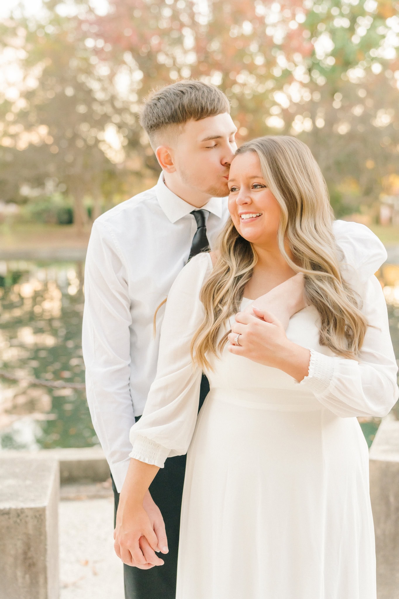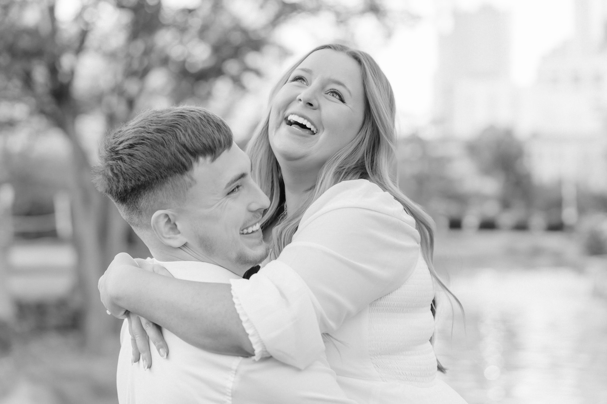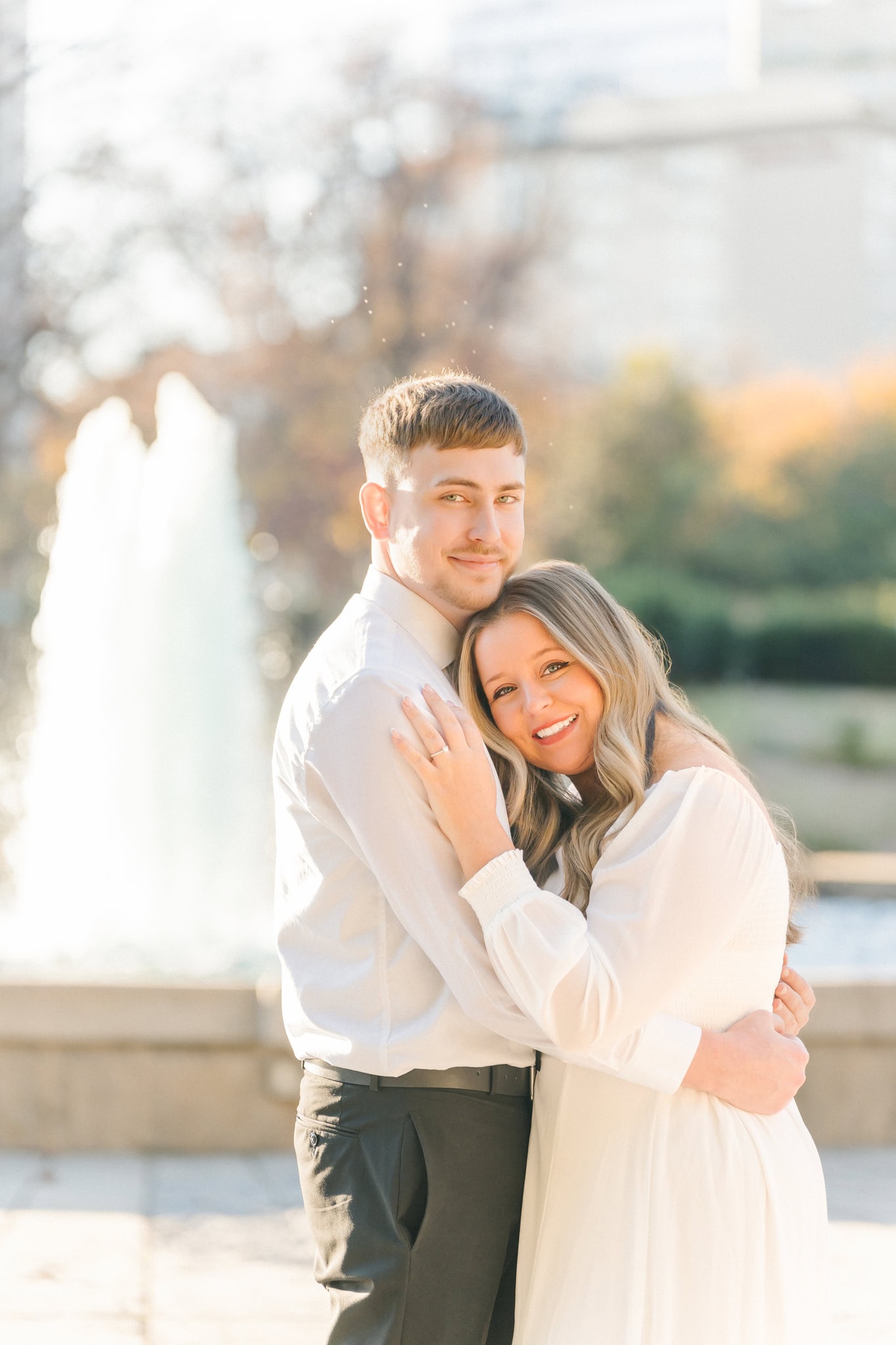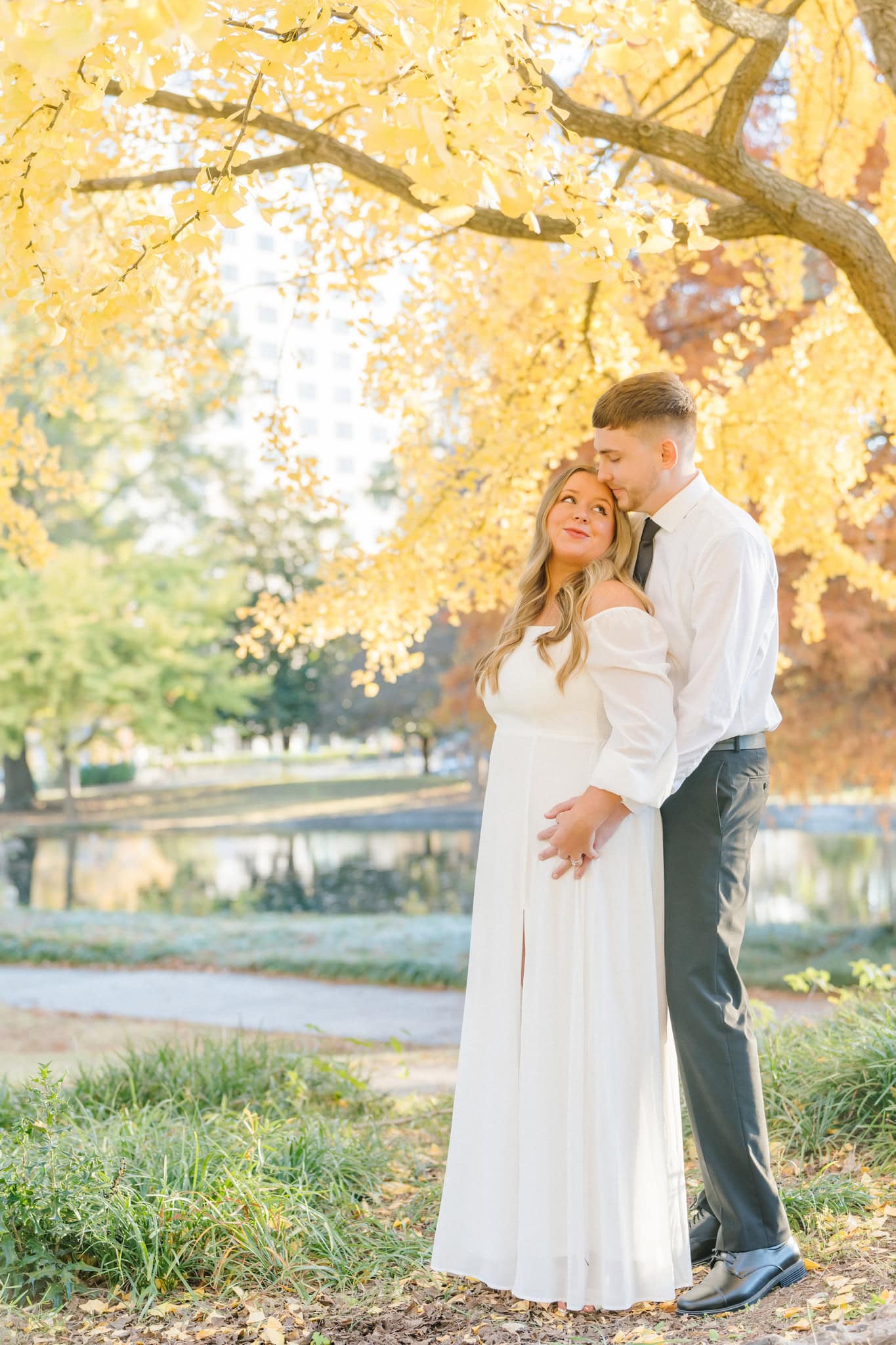 The leaves were just starting to carpet the ground in rich oranges and golds, and it made every shot glow. One of my favorites moments was in front of my favorite tree (the ginkgo tree), wrapped in each other’s arms, with that late-fall sunshine filtering through the trees behind them. It didn’t feel staged. It felt real and intimate. They laughed easily, teased each other in that cute way only couples do, and let their personalities shine.