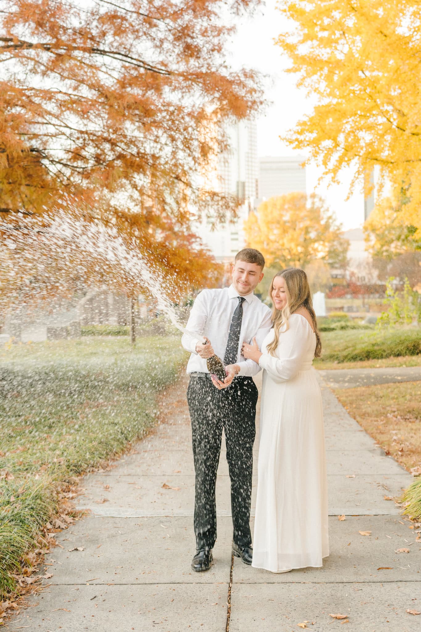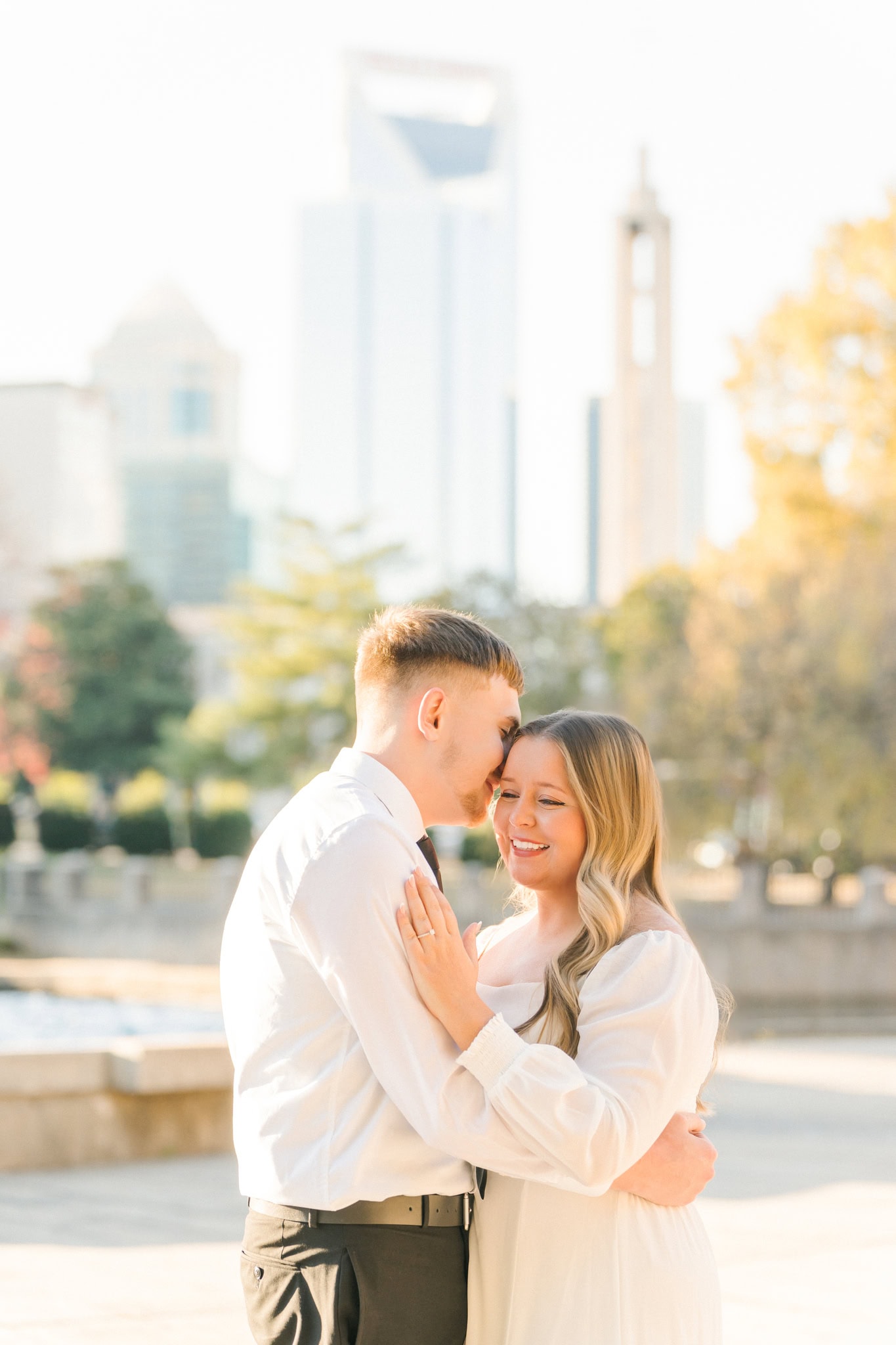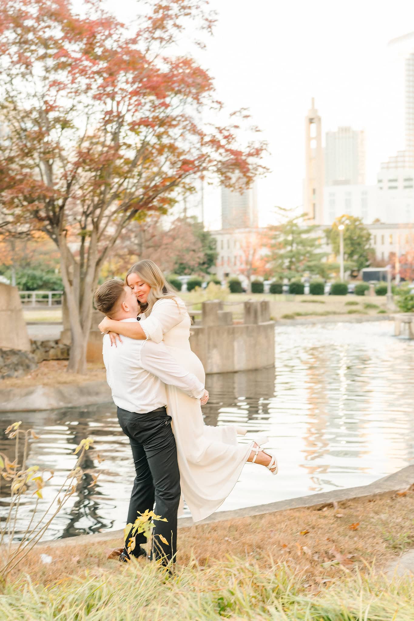 As the sun dipped lower, they made their way down to the edge of the park where the city skyline peeks through the branches. That contrast, the organic fall setting against Charlotte’s architecture, made for some of the most dynamic frames of the whole session.