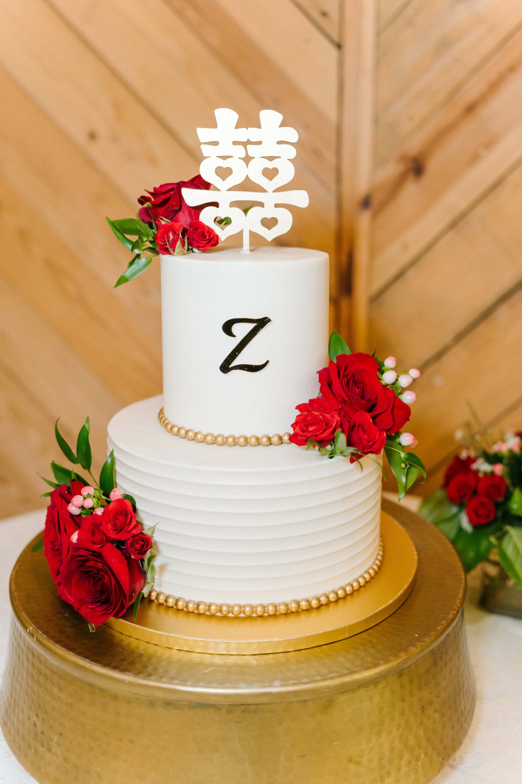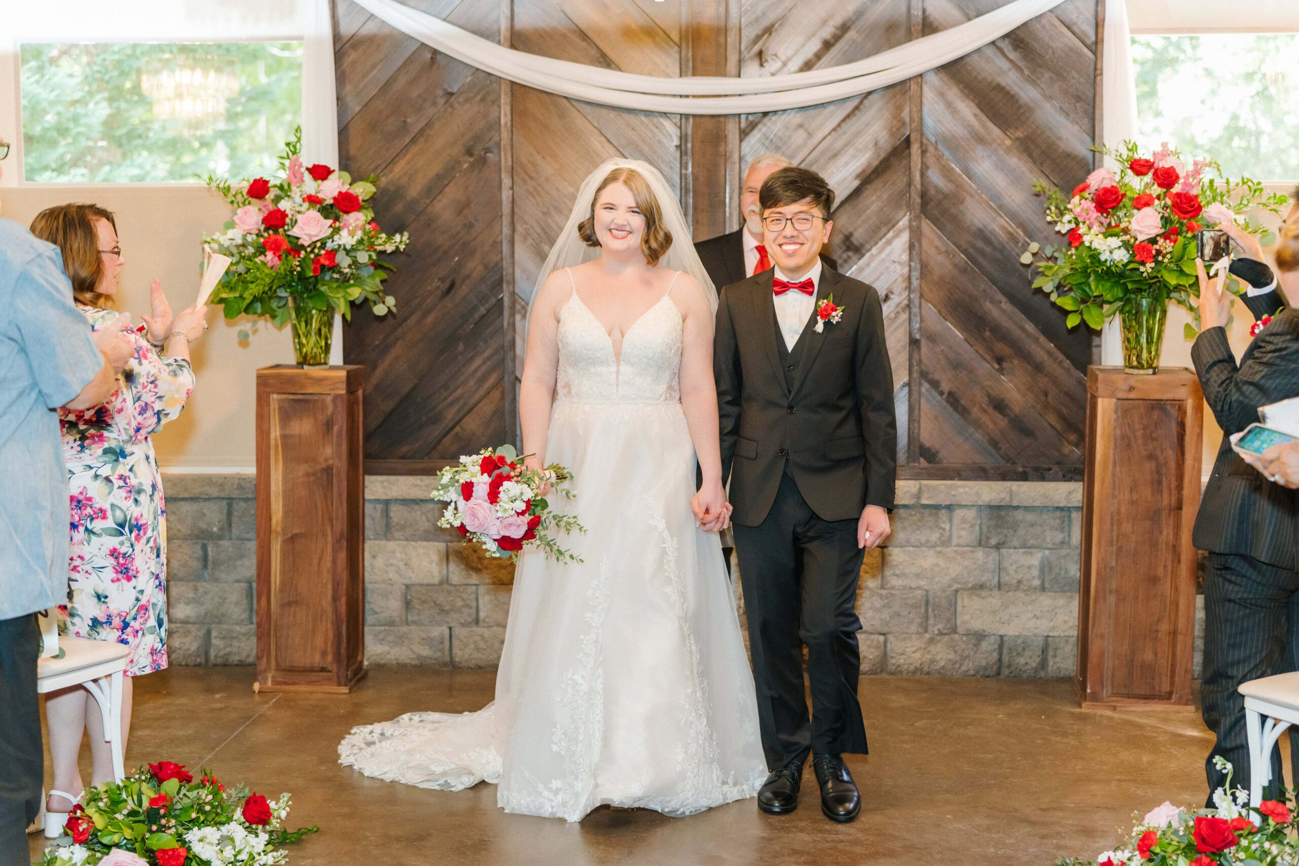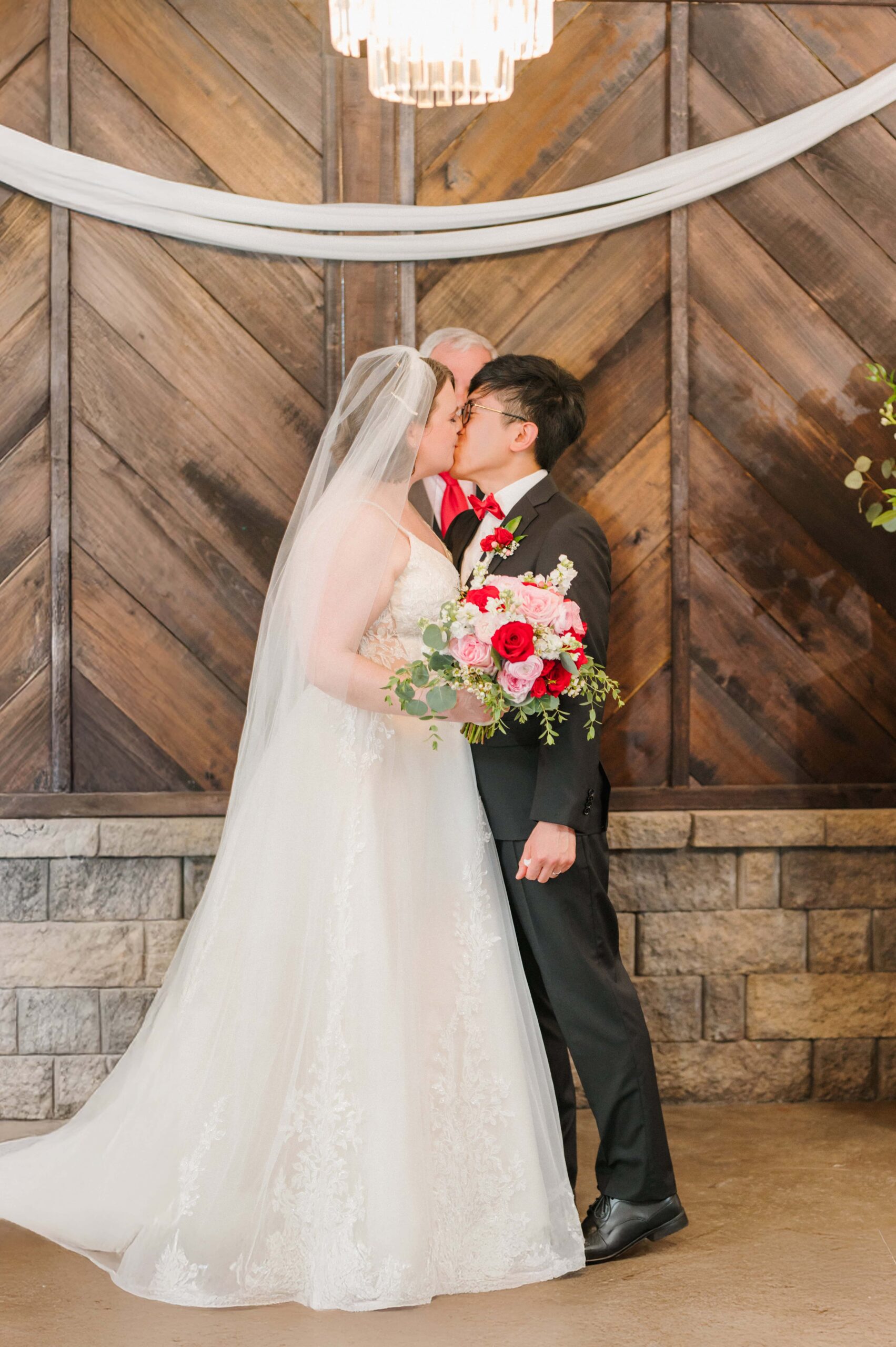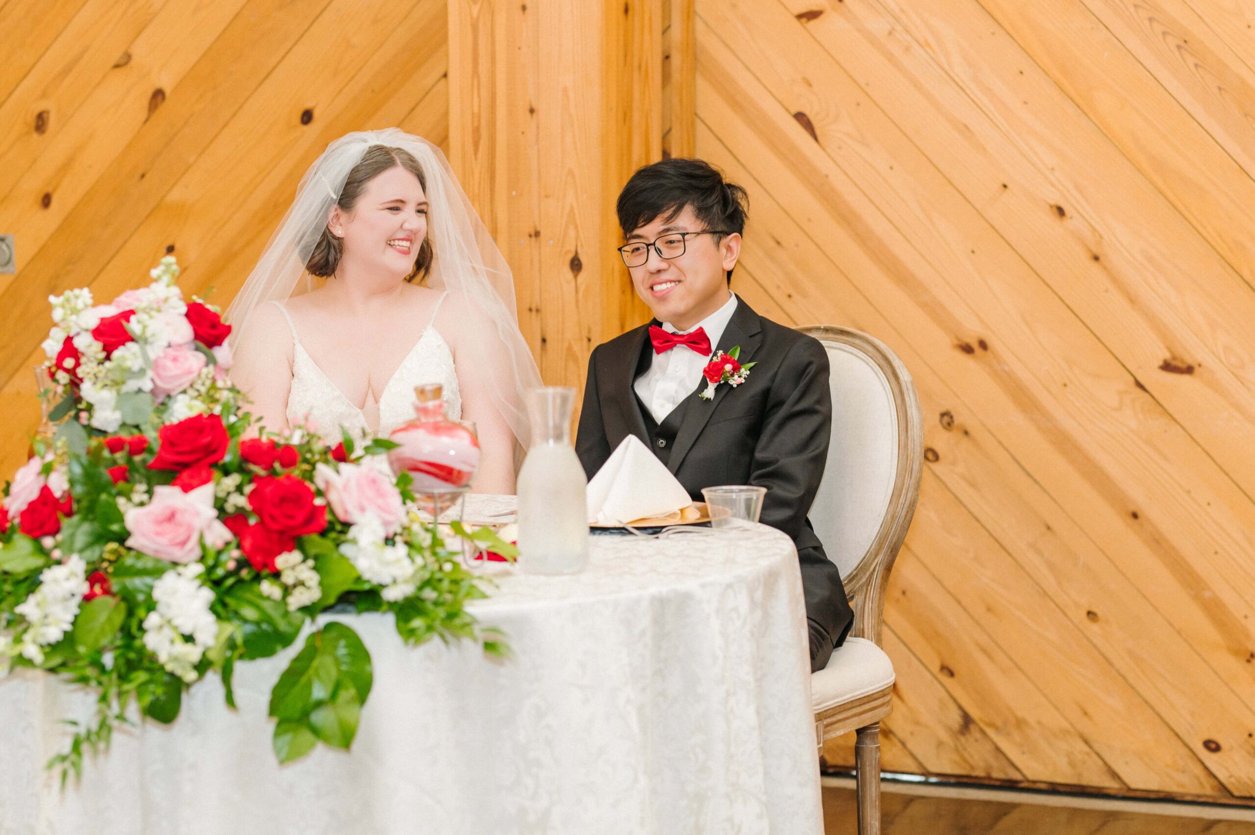 The ceremony took place in the barn of Alexander Homestead to beat the outside heat and keep those red florals from Mint Hill Flower Market blooming fresh. Red, a symbol of luck, joy, and prosperity in Chinese weddings, was woven throughout the day not only in their flowers, but even in things like their decadent red velvet cake by Sweet It Is. It was such a meaningful way to honor Yan’s heritage while creating a truly personalized celebration.